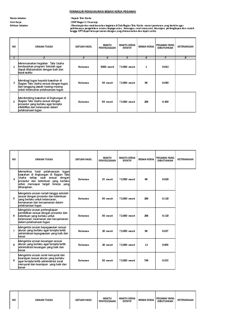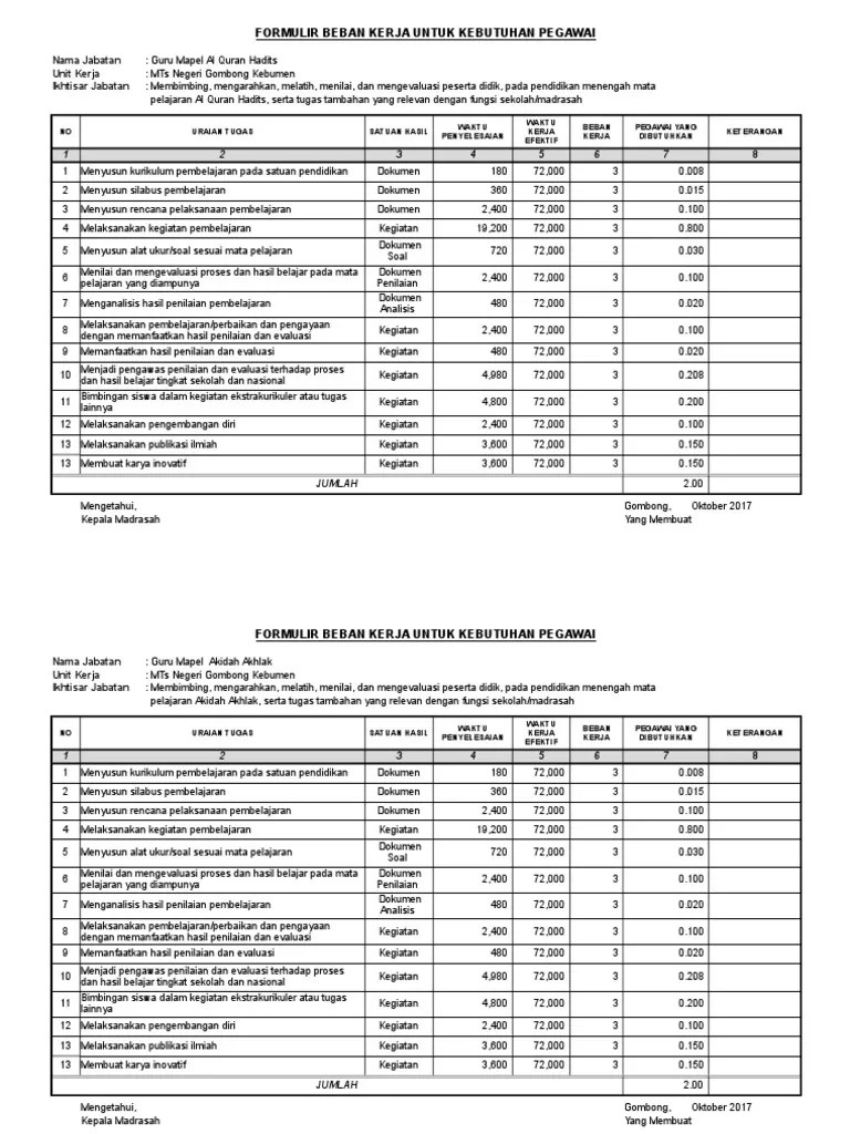 "analisis penerapan pemenuhan beban kerja guru dalam kaitannya dengan dampak pengiring pada pendidikan agama siswa mi mujahidin loloan barat jembrana." Penilaian kinerja guru terbaru (2019) dalam permendikbud nomor 15 tahun 2018 pasal 2 ayat (1) guru, kepala sekolah, dan pengawas sekolah melaksanakan beban kerja selama 40 (empat puluh) jam dalam 1 (satu) minggu pada satuan administrasi pangkal. Waktu tertentu, atau dengan kata lain analisis beban kerja bertujuan untuk menentukan berapa jumlah personalia dan beberapa jumlah tanggung jawab atau beban kerja yang tepat dilimpahkan kepada seortang petugas. beban kerja kepala sekolah sepenuhnya untuk melaksanakan tugas manajerial, pengembangan kewirausahaan dan supervisi kepada guru dan tenaga kependidikan. Demikian surat keterangan ini dibuat. Kumpulan gambar tentang contoh analisis beban kerja guru, klik untuk melihat koleksi gambar lain di kibrispdr.org Mengoptimalkan tugas guru di sekolah 3. Jenis penelitian ini adalah deskriptif kausal dengan teknik analisis data menggunakan analisis regresi linear berganda. Pada buku panduan praktis menyusun analisa beban kerja ini dijelaskan secara gamblang bagaimana pengertian, metode, manfaat, dan cara penghitungan dalam melakukan analisis beban kerja karyawan. Aplikasi analisis beban kerja (abk) analisis jabatan adalah merupakan sebuah proses, metode serta teknik untuk mendapatkan data jabatan yang diolah menjadi informasi jabatan guna menyusun sebuah kebijakan program pembinaan / penataan kelembagaan, kepegawaian, ketatalaksanaan dan perencanaan diklat. Berikut yang dapat kami bagikan terkait contoh analisis beban kerja guru sd. Video ini menjelaskan mengenai metode penghitungan kebutuhan pns berdasarkan perka bkn no. Surat keterangan beban kerja (skbk) dalam melaksanakan tugasnya sebagai guru, pada semester ganjil tahun pelajaran 2014/2015 secara komulatif telah memenuhi beben kerja minimal dan oleh karena itu yang bersangkutan dapat menerima tunjangan profesi dari kementerian agama sesuai dengan ketentuan yang berlaku.